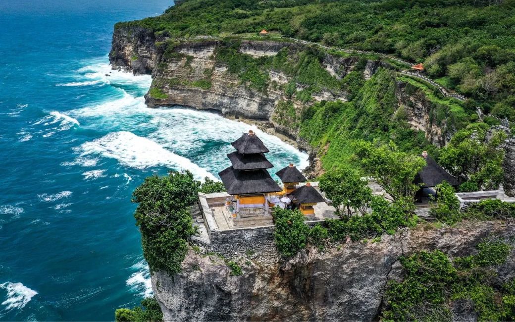 Uluwatu is an area in South Bali known for Pura Luhur Uluwatu, an iconic clifftop temple with spectacular views of the Indian Ocean, as well as beautiful beaches and great surfing waves. The area is also known for its sunset Kecak dance performances, white sand beaches, and numerous beach clubs.
